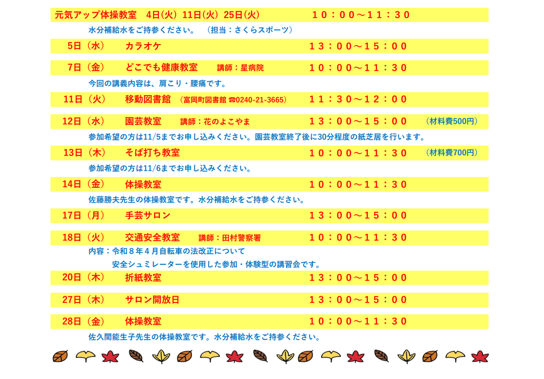 富岡町サポートセンター平沢 行事予定表2025年11月 [その他のファイル/247KB]富岡町サポートセンター平沢 行事予定表2025年11月 [その他のファイル/266KB]