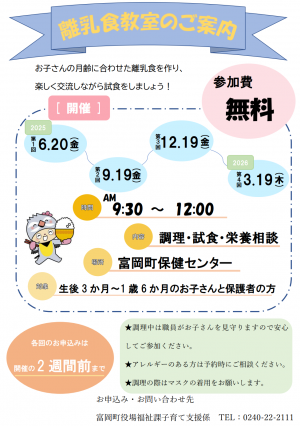 本年度も離乳食教室を開催します! お子さんの月齢に合わせた離乳食を作り、楽しく交流しながら試食をしましょう! 開催日等の詳細は添付の資料をご参照いただき、福祉課子育て支援係までお申し込みください。
