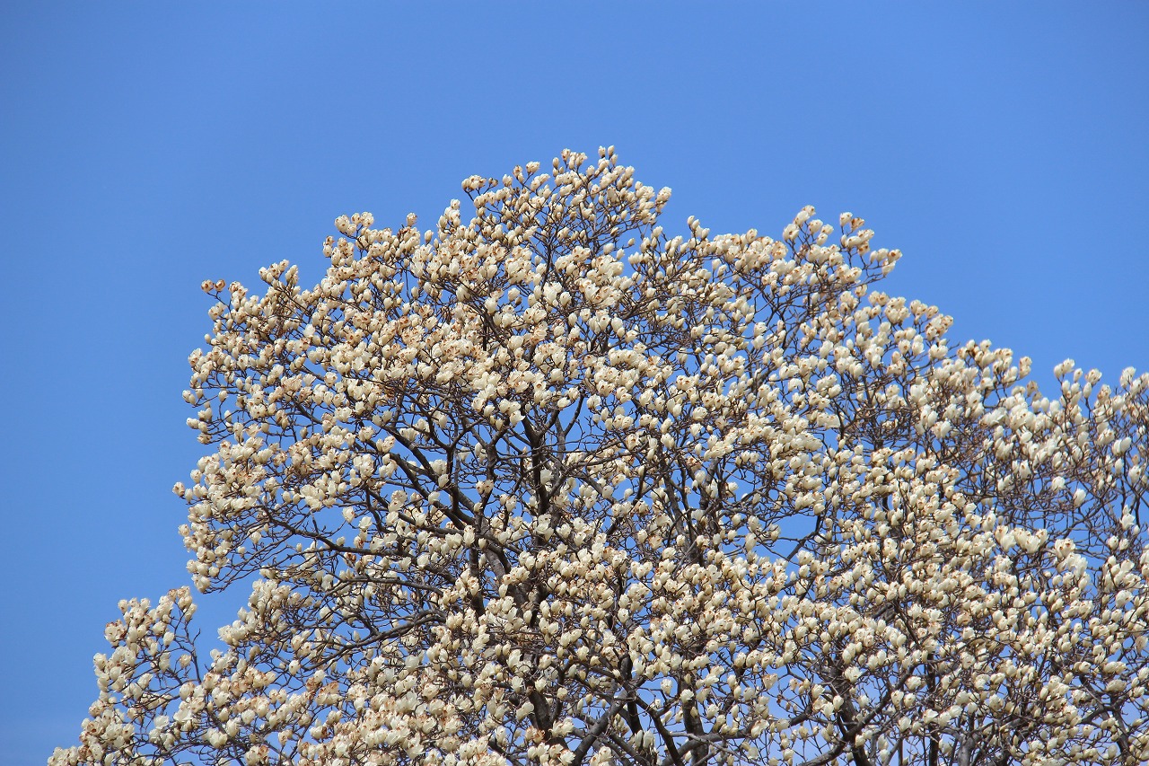 王塚地区・関さん宅の白モクレンです。例年より開花が早いようで、5分咲きといった所でしょうか。青空に白い花が鮮やかに映えています。